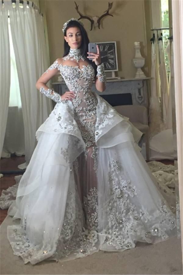Luxury Gothic Wedding Dresses With Detachable Skirt Beaded Lace Appliques High Neck Long Sleeves Bridal Gowns Custom Made Vestidos De Novia Ball Gown