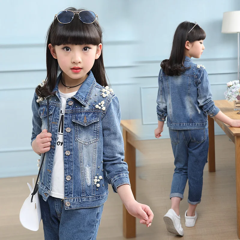 2019 Spring Autumn New Korean Girls Fashion Pearls Denim Coat Kids