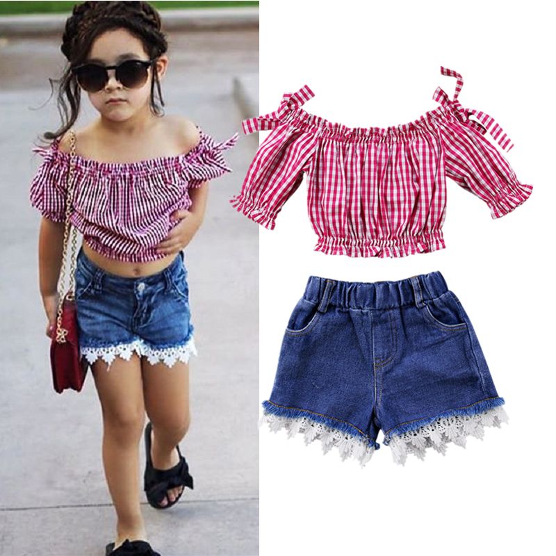2019 Kids Baby Girls Red Plaid Off Shoulder Tops Shorts Jeans Set